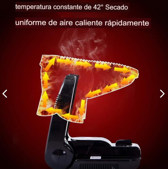 Este secador eléctrico entrega calor constante y suave que elimina la humedad en minutos, sin afectar cuero, tela o goma.